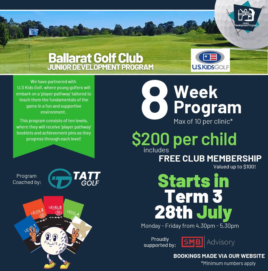 Ballarat Golf Club is proud to partner with U.S. Kids Golf to launch an exciting new junior program designed to inspire the next generation of golfers. Through the U.S. Kids Golf 'Player Pathway', young players will learn the essential skills of golf in a fun, structured, and encouraging environment. The program features ten progressive levels, with each participant receiving their own pathway booklet and achievement pins as they develop their game and reach new milestones.