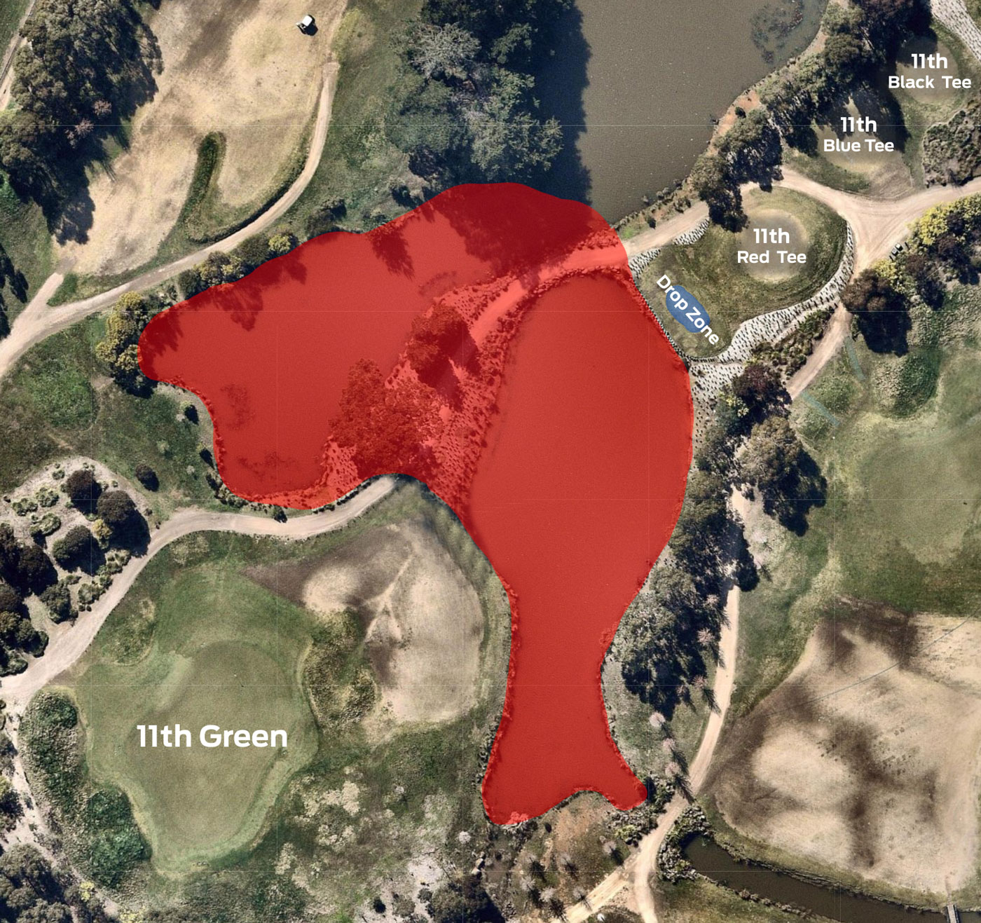 When playing the 11th hole, any ball that finishes in the Penalty Area highlighted in RED is to be played from the Drop Zone located in front of the 11th Ladies Tee if their original ball cannot be played.